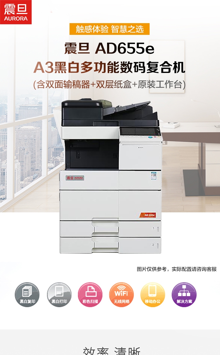 | 产品名称 : | 震旦(AURORA)AD655e A3黑白多功能数码复合机(含双面同步扫描输稿器+双层纸盒+原装工作台) |