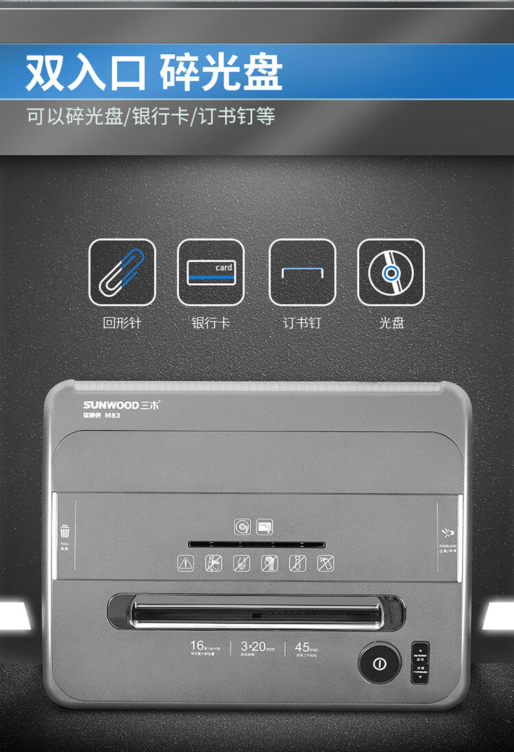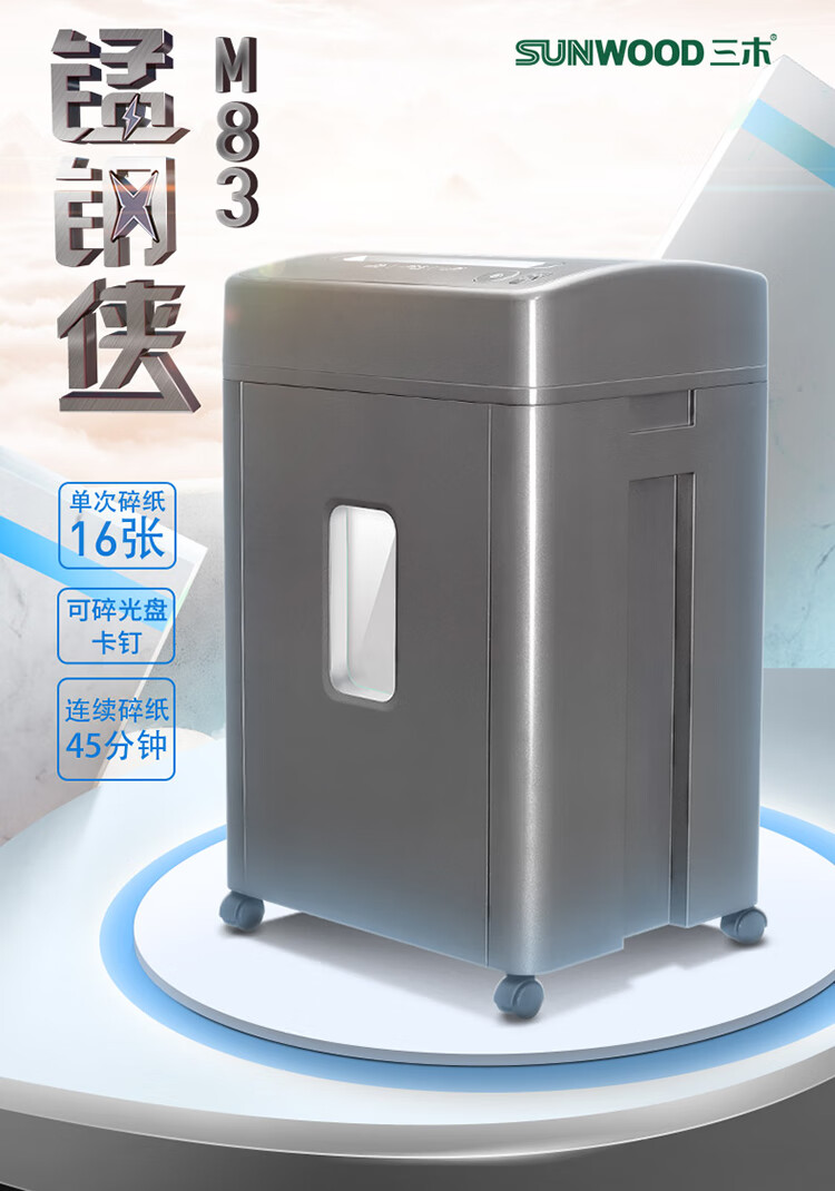 | 产品名称 : | 三木(SUNWOOD)M83锰钢侠系列碎纸机 办公家用双入口 光盘文件粉碎机 |