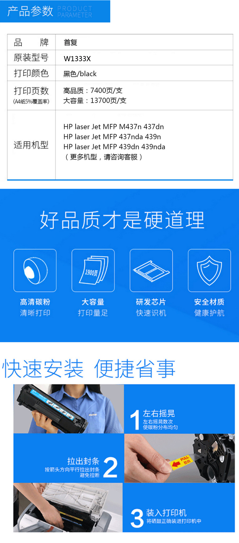 | 产品名称 : | 首复W1333X(333X)粉盒 适用惠普HP LaserJet MFP m437n m437dn m437nda m439n m439nda m439dn大容量粉盒 w1333x墨盒 黑色(约13700页) |