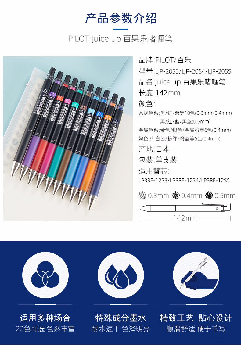 | 产品名称 : | 日本百乐(PILOT)Juice Up新款彩色中性笔手账笔 浅蓝色 0.4mm 10支装 LJP-20S4-LB原装进口 |