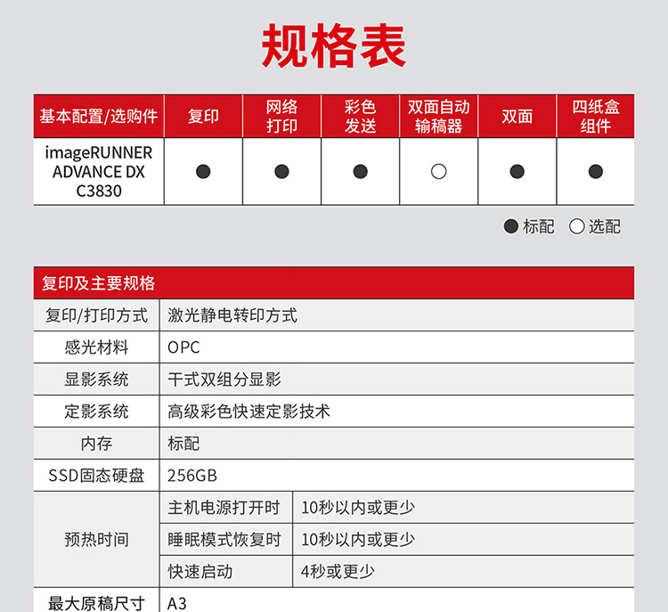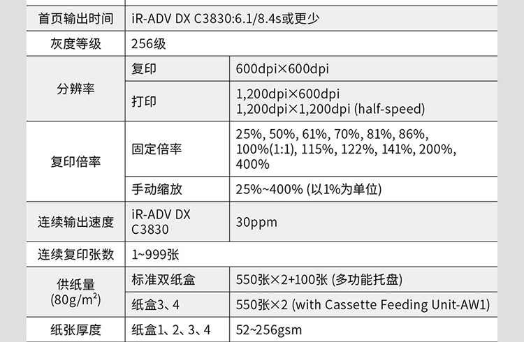 产品名称 : 佳能(Canon)大型打印机iR-ADV DX C3830 商用办公a3a4彩色多功能复印机含输稿器四纸盒(含三年保)(否 彩色 激光静电 是)